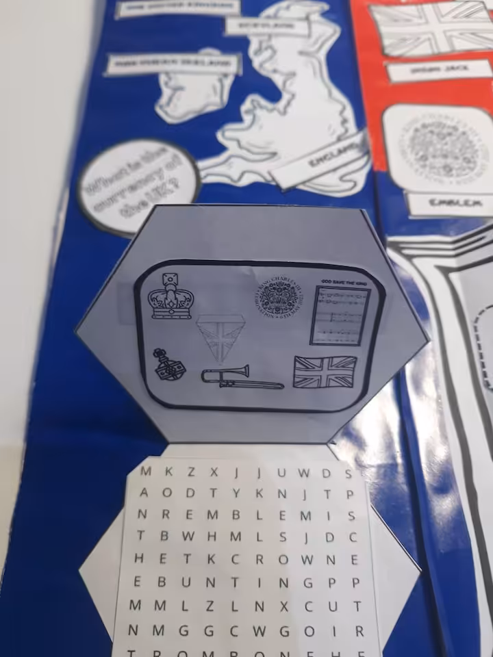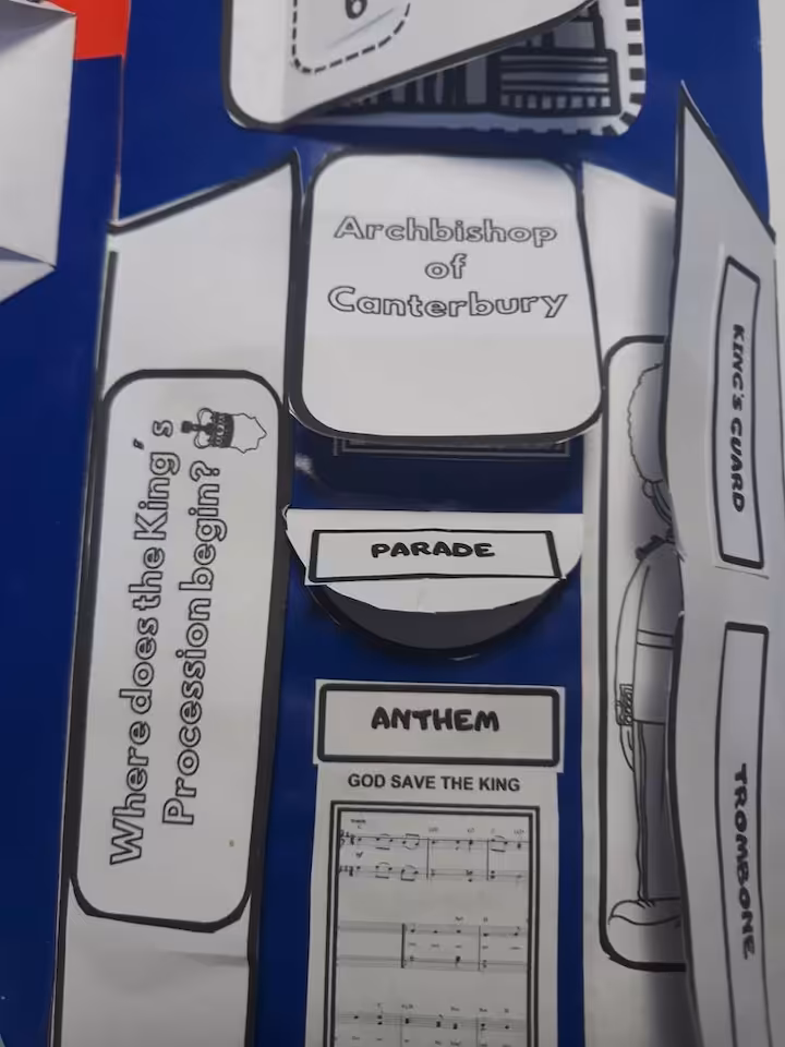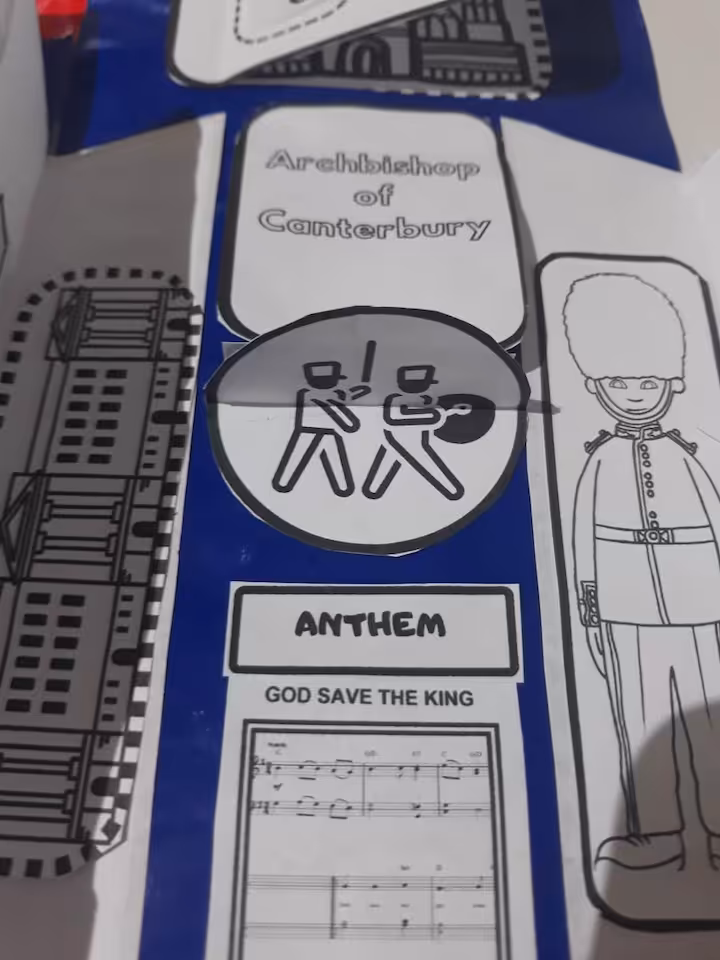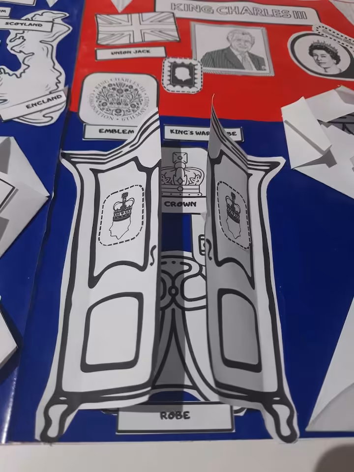 Lapbook jest w wersji czarno białej. Zawiera słownictwo związane z Koronacją Króla Karola, symbole i zabytki Londynu oraz mapę The UK. Duża ilość elementów lapbooka do pokolorowania, odgadnięcia i nazwania sprawi, że uczniowie poczują się jak prawdziwi uczestnicy koronacji:)